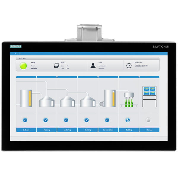 SIMATIC IPC477E PRO fully protected IP65; 19″ multi-touch (1366 x 768); Core i5-6442EQ; 3x Gigabit Ethernet (IE/PN); 4GB RAM; 240 GB SSD; without Operating system; 24V DC Industry power supply; for support arm (not expandable, flange top), 4 USB (back); without USB (front); Ethernet (10/100/1000).